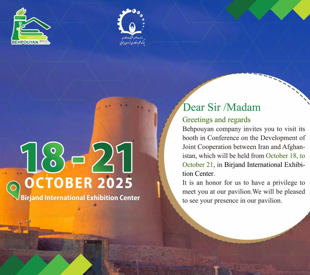بدینوسیله از شما سروران گرامی دعوت می نماییم از غرفه شرکت دانش بنیان بهپویان در نمایشگاه فرصت های مشترک تجارت و سرمایه گذاری ایران و افغانستان واقع در محل دائمی نمایشگاه های بین المللی بیرجند بازدید بعمل آورید.